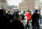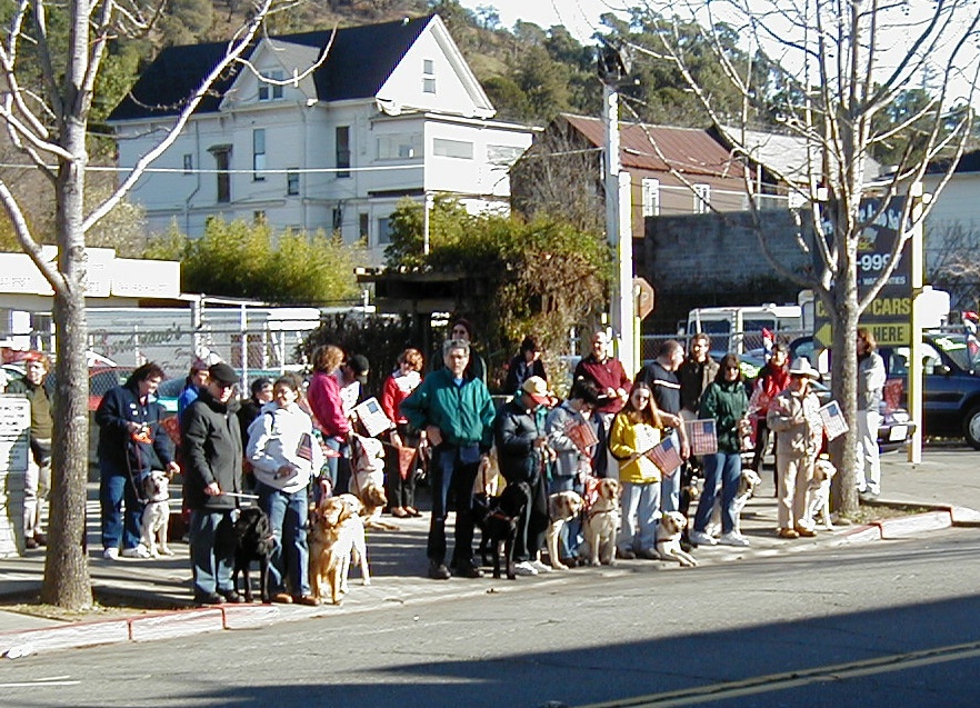 Guide dogs and their people waiting for the torch to come by. |
